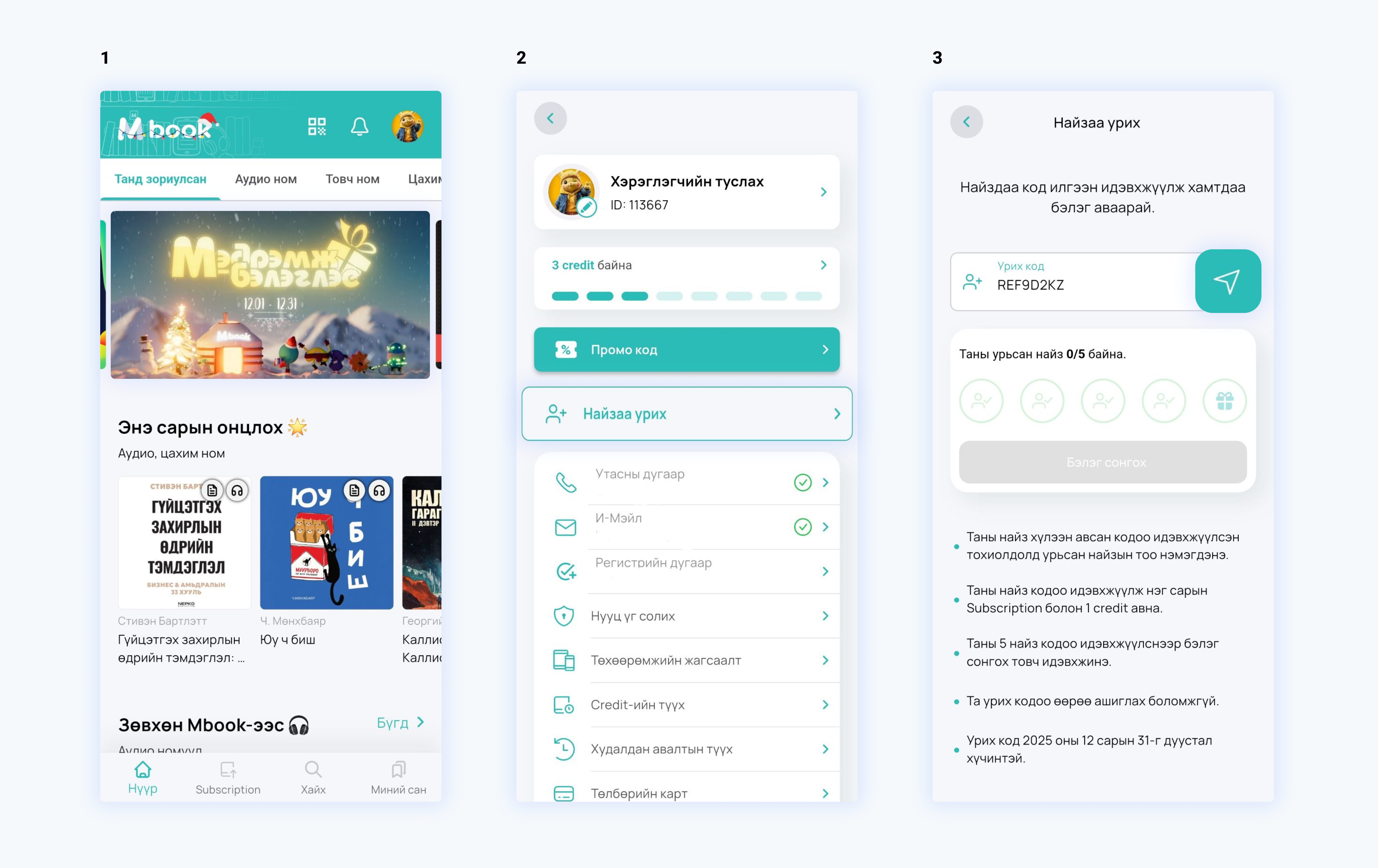 5 найзууд тань таны кодыг хэрэглэн 1 сарын турш Subscription үйлчилгээний дуртай цахим, аудио номуудаа сонсох эрхтэй болохын зэрэгцээ та өөрөө дараах: